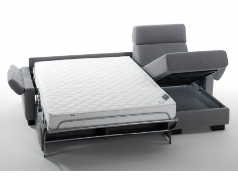 Transformable en lit ouverture en une seule rotation en conservant les coussins d'assise et de dossier en place.