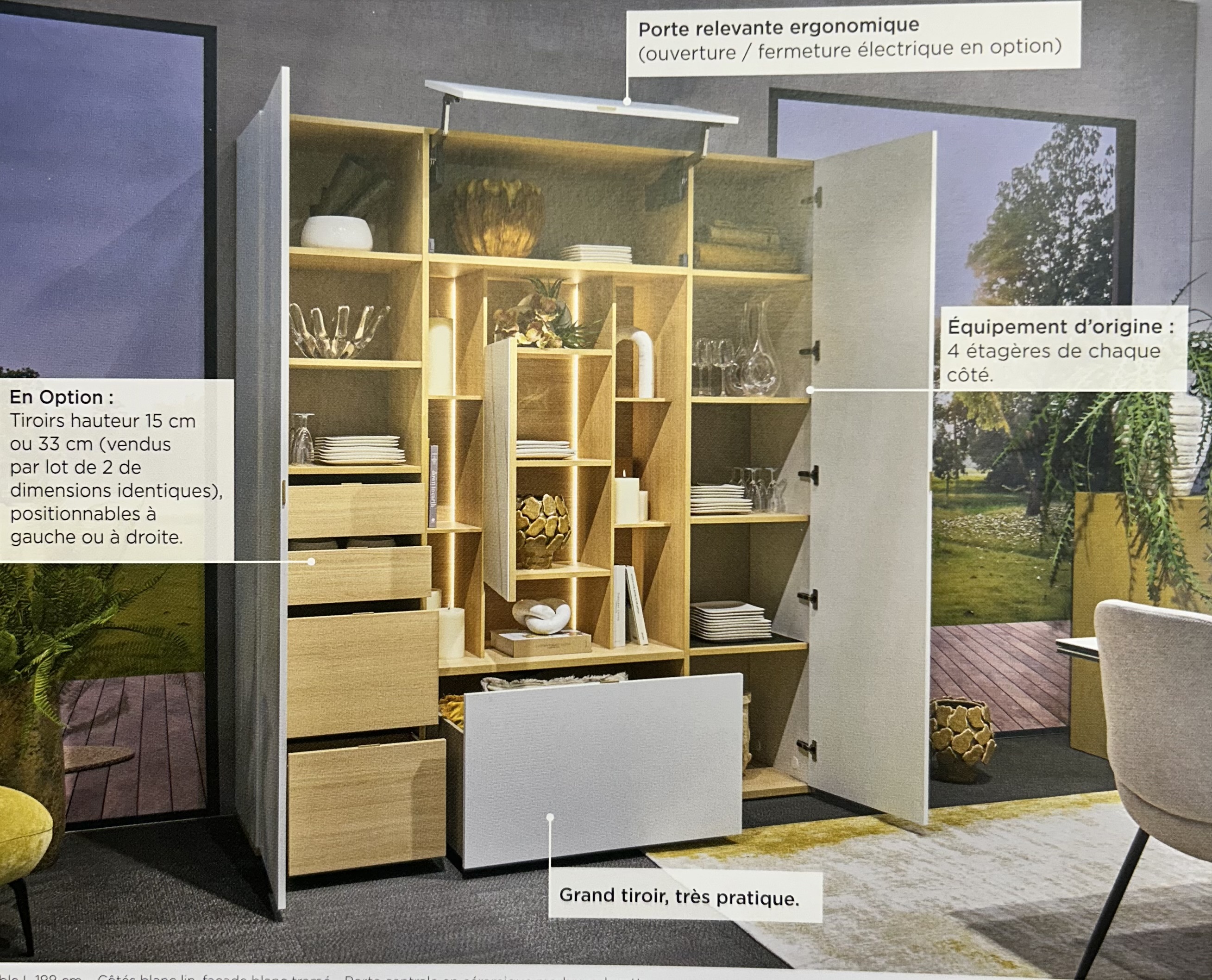 Avec ses niches centrales éclairées, il met en valeur vos objets déco tout en gardant un espace épuré grâce à ses rangements fermés.